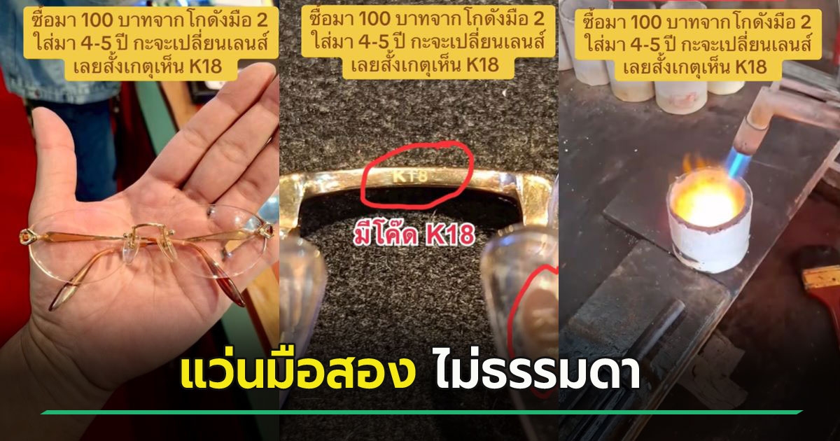 โดยผู้ใช้ TikTok @bussabongsomphamit จากนะโมบ้านช่างทอง ได้เผยคลิปขณะมีลูกค้านำแว่นตามาที่ร้านทอง พร้อมระบุว่า เป็นแว่นที่ซื้อมา 100 บาท จากโกดังมือ 2 ใส่มา 4-5 ปีแล้ว กะจะเปลี่ยนเลนส์ เลยสังเกตเห็นตัวอักษร K18 ที่สลักไว้ จึงนำมาหลอมที่ร้านทอง