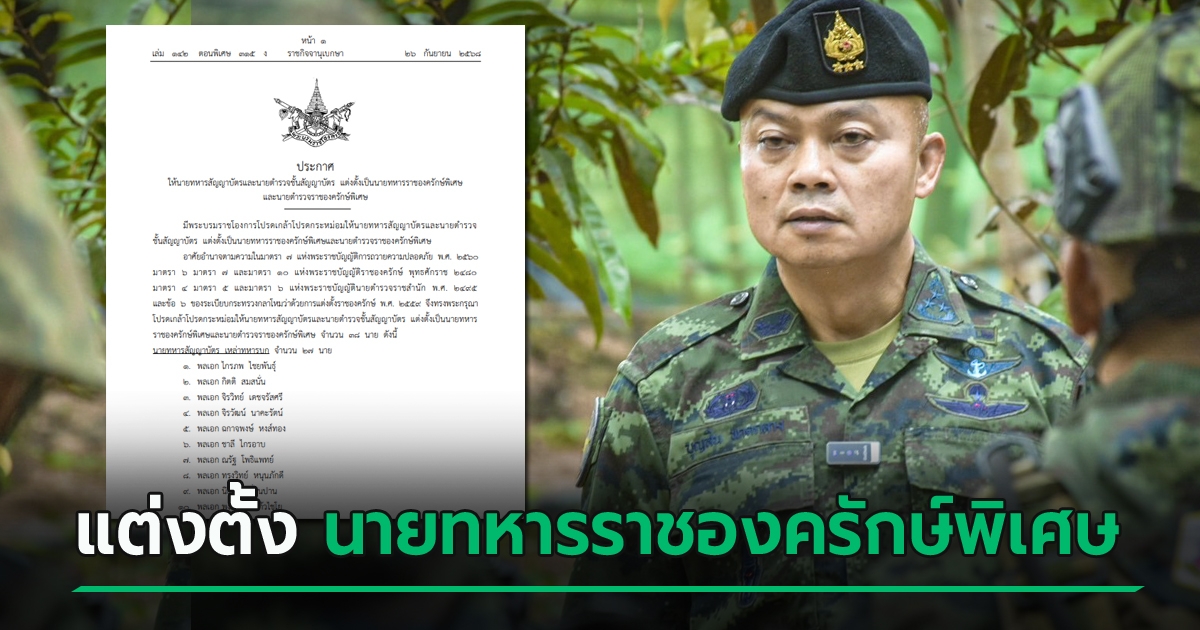 โปรดเกล้าฯ แต่งตั้งนายทหาร-นายตำรวจราชองครักษ์พิเศษ พบมีชื่อ พลโท บุญสิน พาดกลาง มีผล 1 ตุลาคม 2568 หลัง แม่ทัพกุ้ง เกษียณ
