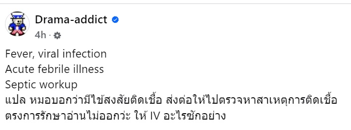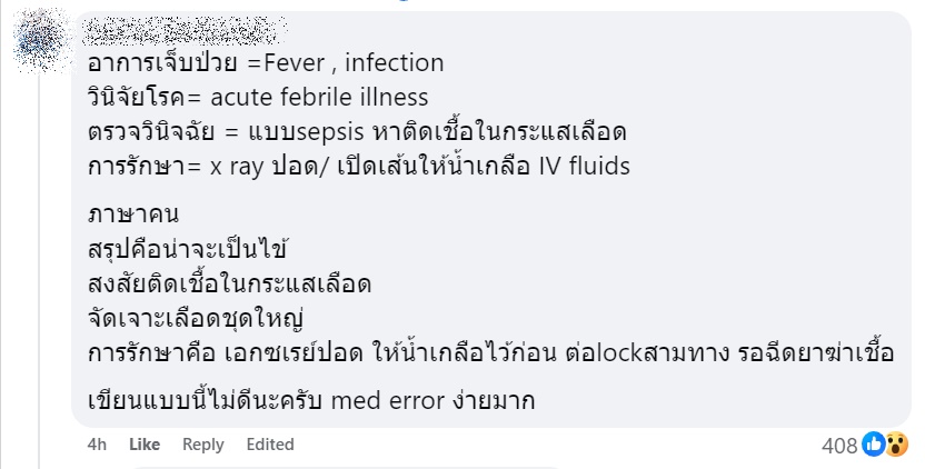 ภาษาคน สรุปคือน่าจะเป็นไข้ สงสัยติดเชื้อในกระแสเลือด จัดเจาะเลือดชุดใหญ่ การรักษาคือ เอกซเรย์ปอด ให้น้ำเกลือไว้ก่อน ต่อ lock สามทาง รอฉีดยาฆ่าเชื้อ