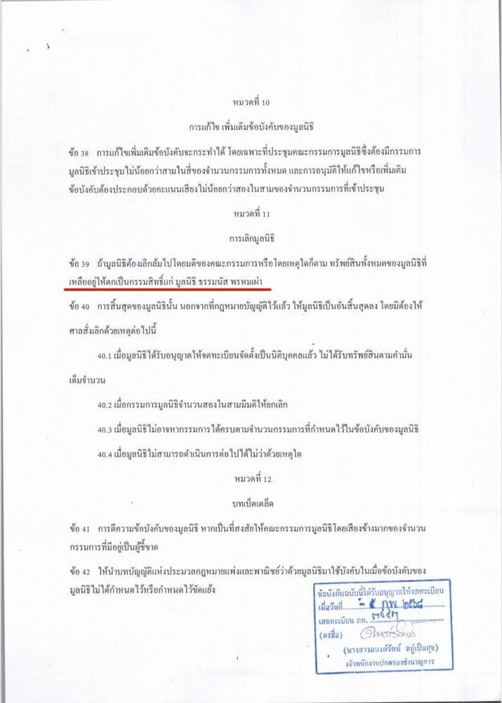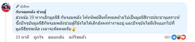 ส่วนประเด็นเรื่องข้อ 39 กัน จอมพลัง ระบุว่า "หากเลิกมูลนิธิกันจอมพลัง ให้ทรัพย์สินทั้งหมดย้ายไปเป็นมูลนิธิราชประชานุเคราะห์ ซึ่งปัจจุบันมูลนิธิกันจอมพลังช่วยสู้ก็ยังไม่ได้เลิก ยังคงทำงานอยู่ และปัจจุบันไม่มีเงินออกไปที่มูลนิธิธรรมนัส เวลาจะคัดคนครับ"