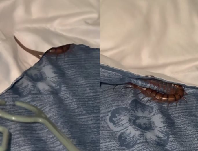 หญิงสาวได้ถ่ายคลิปเอาไว้ในช่วงเวลาดังกล่าว โดยจะเห็นว่า เธอเห็นว่ามีตัวอะไรแปลก ๆ ซ่อนอยู่ใต้หมอน เธอจึงได้ไปหยิบไม้แขวนเสื้อออกมา เพื่อที่จะใช้เขี่ยดู จากนั้นเธอก็เข้าไปใกล้ ๆ แล้วค่อย ๆ ใช้ไม้แขวนเสื้อเปิดปลอกหมอนขึ้น จนกระทั่งได้เห็น "ตะขาบยักษ์" เธอรู้สึกกลัวจนมือสั่นรัว