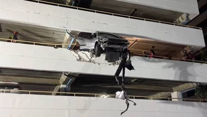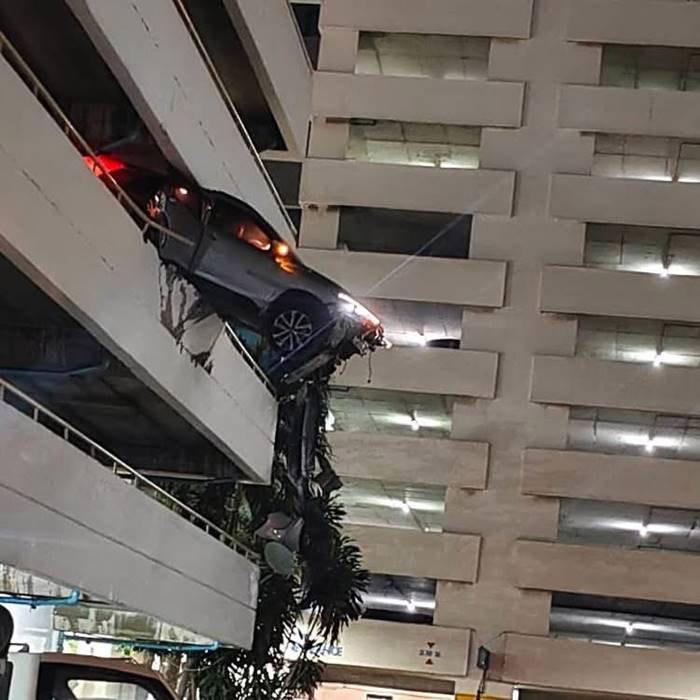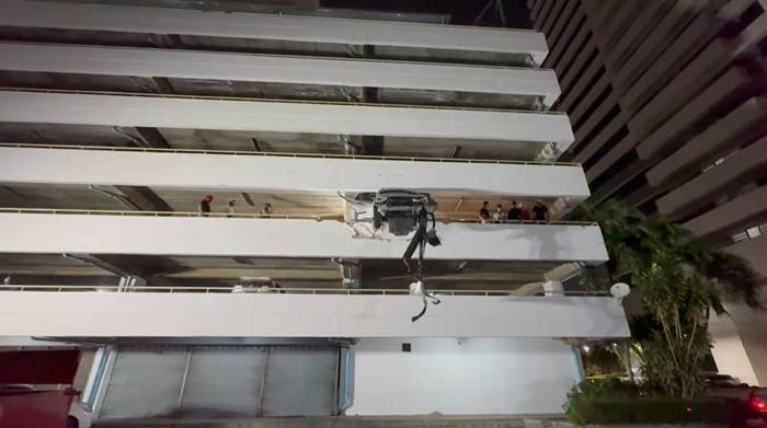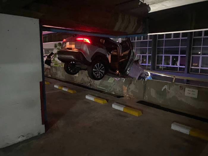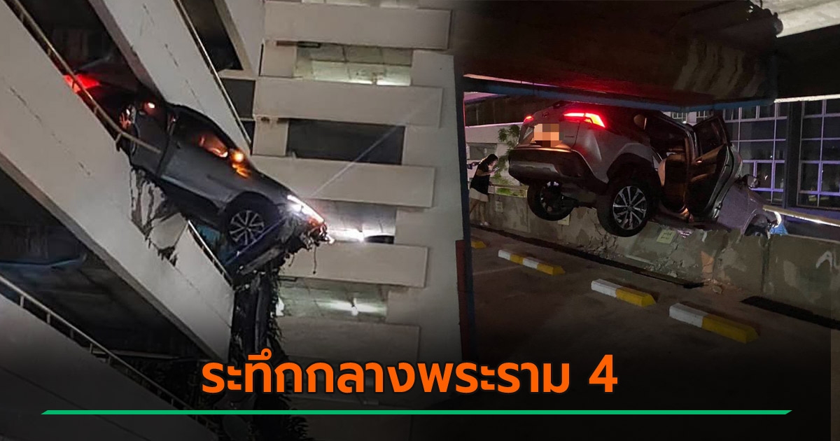 เก๋งพุ่งทะลุกำแพงลานจอดรถย่านพระราม 4 แขวนคาขอบอาคาร 7 ชั้น คนขับรอดหวุดหวิด เผยเหตุเหยียบเบรกผิดเป็นคันเร่ง